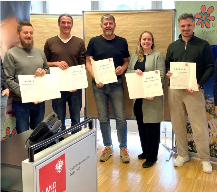 Marco Haidinger und Matthias Aicher (1. und 2. von links) absolvierten zusammen mit drei weiteren TeilnehmerInnen aus ganz Tirol erfolgreich die Ausbildung zum Tiroler Abfall- und Umweltberater. Der AEV gratuliert herzlich!