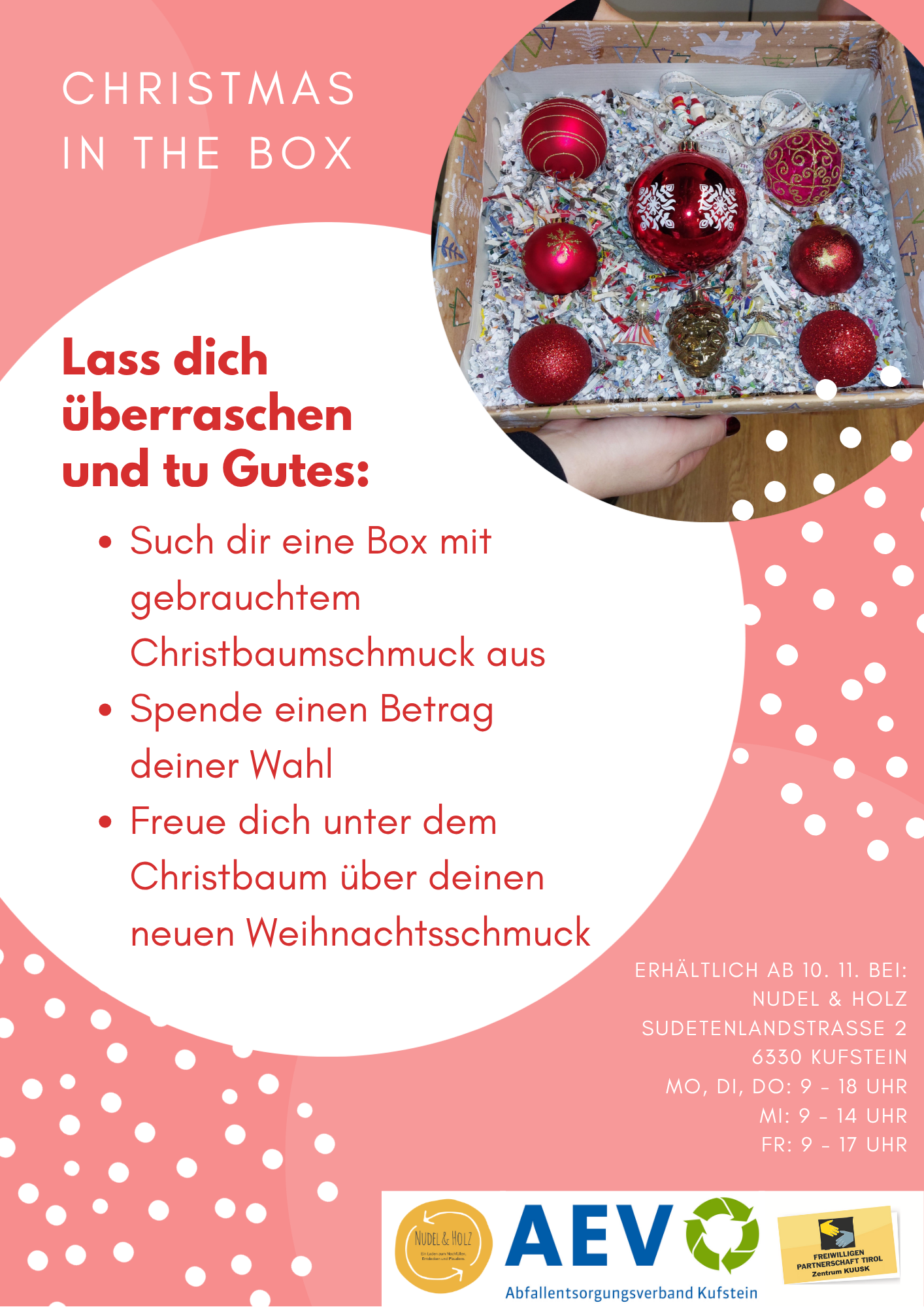 Die Boxen wurden mit viel Hingabe und Kreativität zusammengestellt – gefüllt mit gesammeltem, gebrauchtem Christbaumschmuck und dekorativ verpackt. Jede einzelne Box ist ein Unikat und zeigt, wie aus einfachen Materialien etwas Wertvolles entstehen kann. Nachhaltigkeit und Wiederverwendung stehen dabei ebenso im Mittelpunkt wie die Idee, Menschen in Kufstein zu unterstützen.